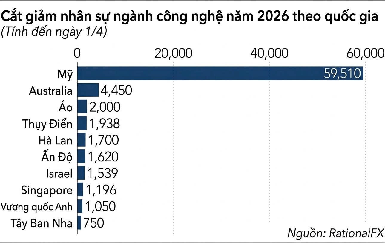 Ngành công nghệ toàn cầu đã cắt giảm 78,557 việc làm từ 1/1 đến 1/4, trong đó Mỹ chiếm 76.7%, theo phân tích từ RationalFX. Đáng chú ý, 37,638 việc làm bị cắt giảm trong số đó được cho là liên quan trực tiếp hoặc gián tiếp đến trí tuệ nhân tạo (AI) và tự động hóa quy trình.