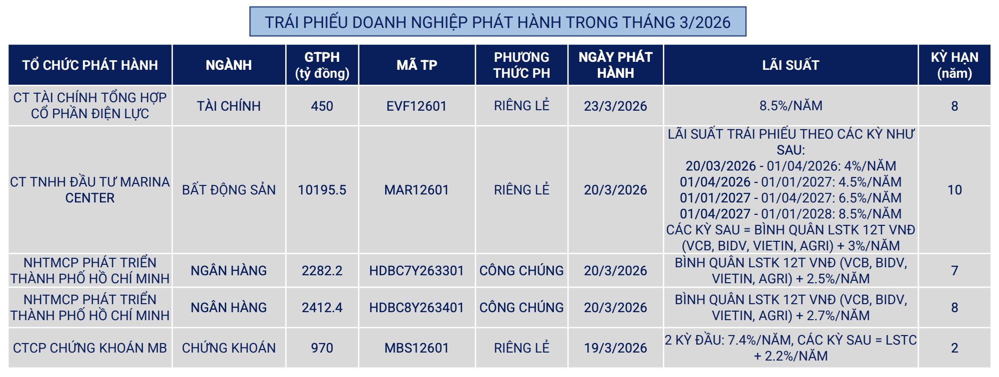 Trên thị trường sơ cấp, tính đến ngày 31/3/2026, có 3 đợt phát hành trái phiếu riêng lẻ trị giá 11.616 tỷ đồng và 2 đợt phát hành ra công chúng trị giá 4.695 tỷ đồng trong tháng 3/2026.