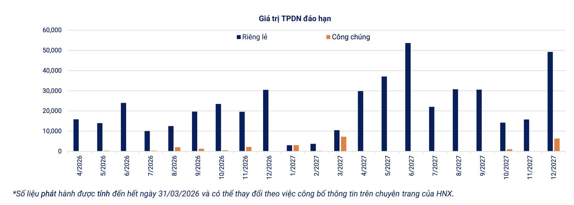 Trong 9 tháng còn lại của năm 2026, giá trị đáo hạn ước tính là 175.987 tỷ đồng. Áp lực này trở nên rõ nét hơn khi trong tháng 3/2026, thị trường đã ghi nhận có 10 mã trái phiếu chậm trả lãi, gốc trị giá 2.205 tỷ đồng.