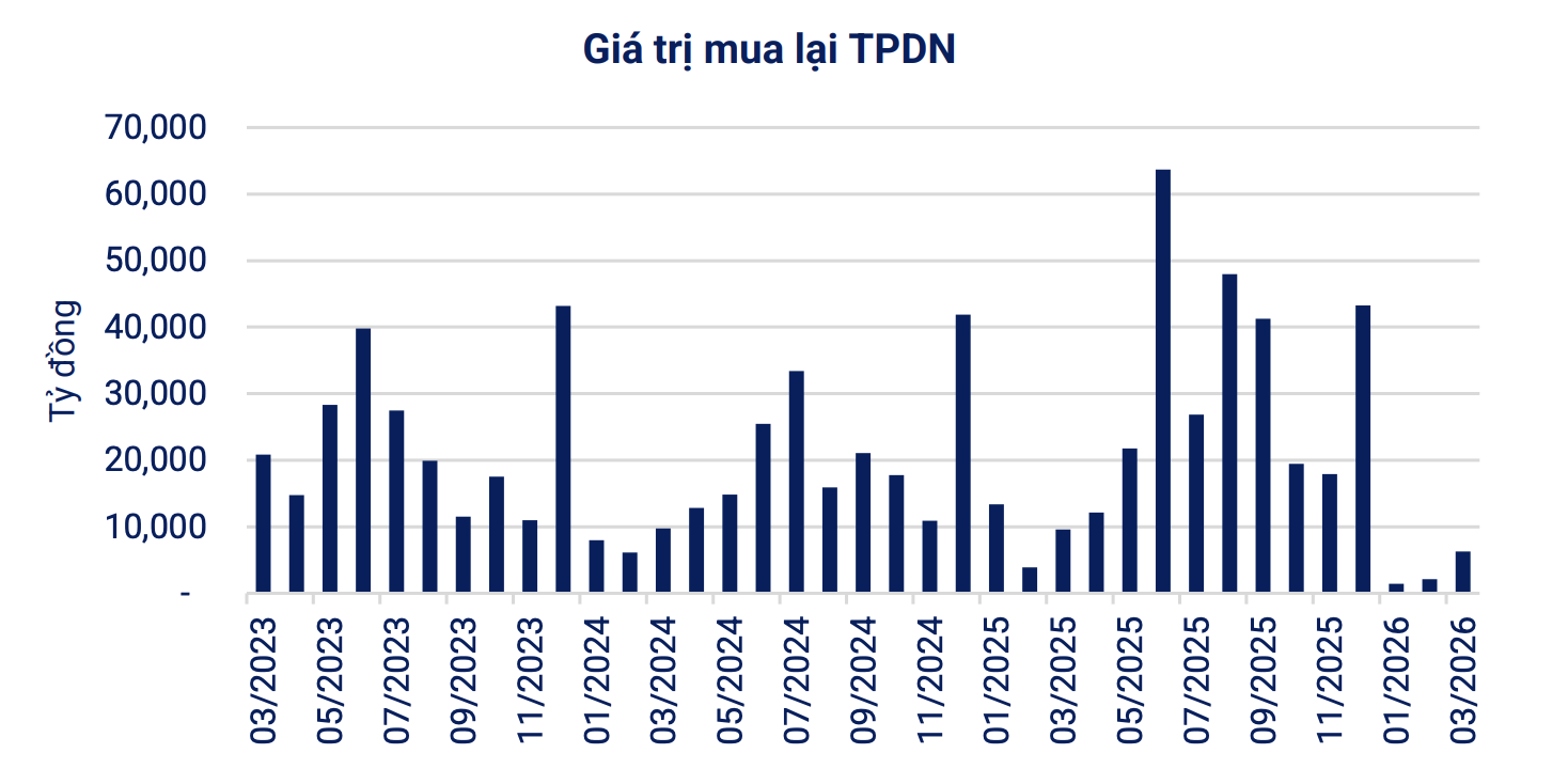 Hoạt động mua lại trái phiếu trước hạn của các doanh nghiệp cũng cho thấy sự trầm lắng. Trong tháng 3, các doanh nghiệp đã mua lại 6.298 tỷ đồng trái phiếu trước hạn, giảm 37% so với cùng kỳ năm 2025, cũng là tháng thứ 4 liên tiếp giảm ở chỉ tiêu này. Việc sụt giảm trong hoạt động mua lại cùng với con số đáo hạn ước tính lớn đặt ra bài toán về cân đối nguồn vốn cho các đơn vị phát hành trong bối cảnh kinh tế vĩ mô có nhiều biến động.