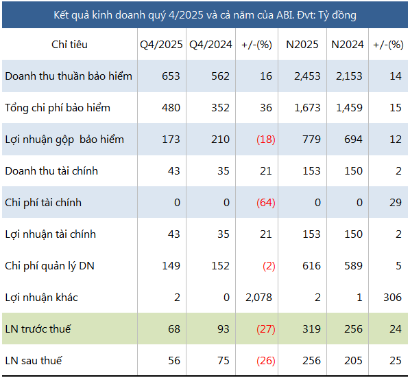 Tính cả năm 2025, lãi ròng của ABI đạt 256 tỷ đồng, tăng 25% so với năm trước, nhờ lợi nhuận bảo hiểm và tài chính lần lượt tăng 12% và 2%. Với kết quả này, ABI hoàn thành kế hoạch lợi nhuận trước thuế tối thiểu 315 tỷ đồng cho năm 2025.