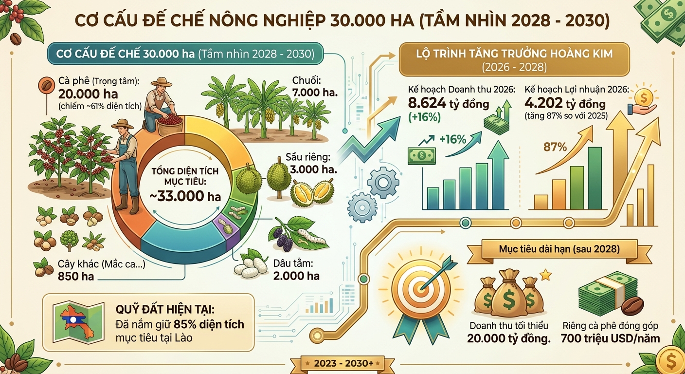 Chiến lược giai đoạn 2026-2030 của HAGL xoay quanh việc mở rộng quy mô canh tác lên khoảng 30.000–33.000 ha vào năm 2028, với cơ cấu cây trồng rõ ràng.