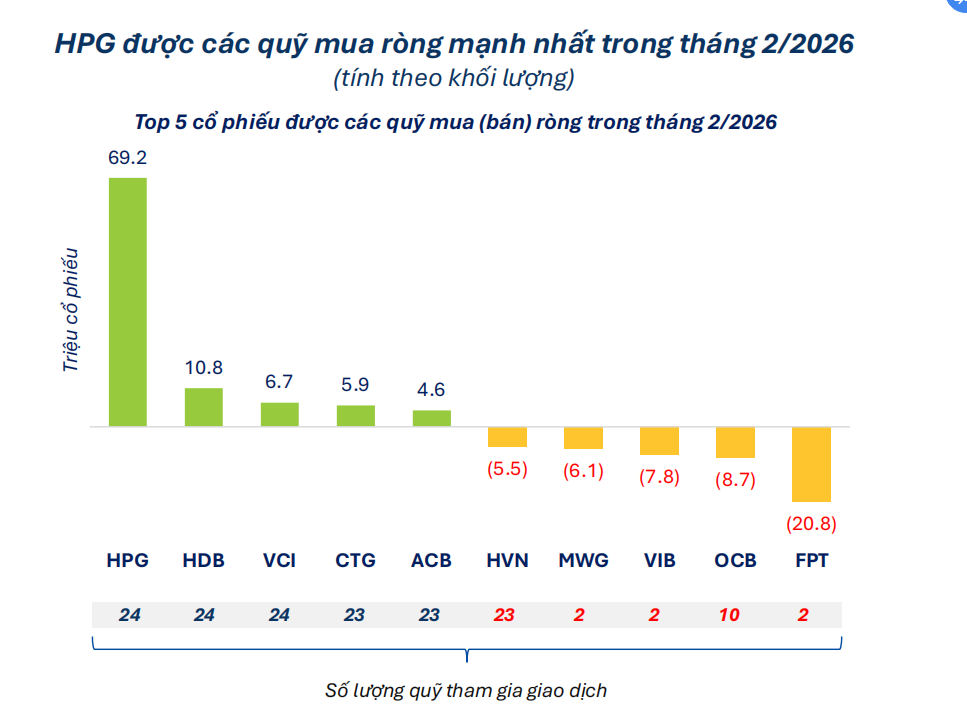 Trong tháng 2/2026, hoạt động mua bán của các quỹ cho thấy sự tập trung rõ vào một vài cổ phiếu. Cụ thể, HPG là mã được các quỹ mua vào nhiều nhất với khoảng 69 triệu cổ phiếu, cao hơn nhiều so với các mã phía sau như HDB (khoảng 11 triệu) hay VCI (gần 7 triệu). Ở chiều ngược lại, FPT là cổ phiếu bị các quỹ bán ra nhiều nhất, với khoảng 21 triệu cổ phiếu, cao hơn đáng kể so với các mã còn lại như OCB hay VIB.