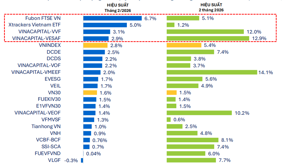 Báo cáo của FiinGroup ghi nhận hiệu suất của nhóm quỹ cổ phiếu trong tháng 2 đã chậm lại so với tháng trước, từ mức khoảng 6,7% xuống còn 5,1%. Nhiều quỹ cũng không còn vượt VNIndex như giai đoạn trước, khi mức sinh lời chỉ quanh 2–3%, khá sát với thị trường chung.