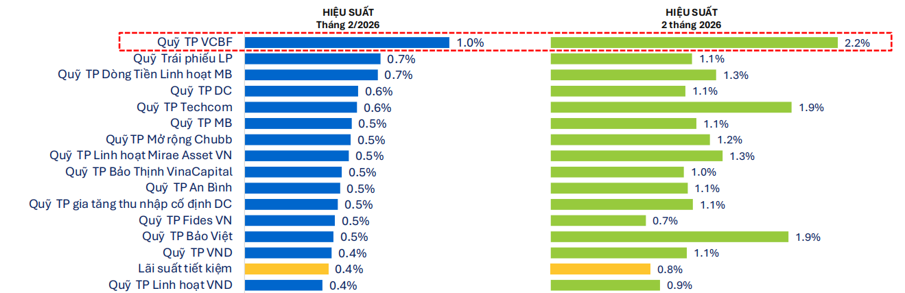 Hiệu suất của các quỹ trái phiếu trong tháng 2/2026 khá thấp và không chênh lệch nhiều giữa các quỹ, chủ yếu dao động quanh 0,4% – 0,7%. Trong đó, quỹ TP VCBF có mức tăng cao nhất khoảng 1,0%, nhưng cũng không vượt trội quá xa so với phần còn lại. Điều này cho thấy nhiều người đang chọn quỹ trái phiếu để giữ tiền an toàn là chính, chứ không kỳ vọng lợi nhuận lớn.
