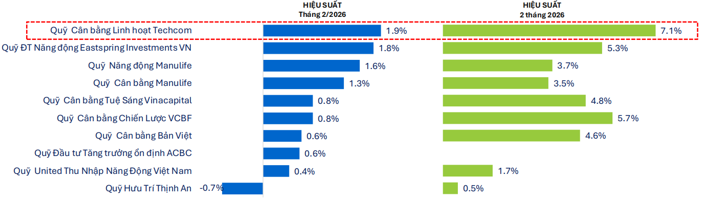 Trong tháng 2, hiệu suất của các quỹ cân bằng chỉ dao động quanh mức 0,6% đến 1,9%. Ngay cả quỹ có kết quả tốt nhất cũng chỉ đạt khoảng 1,9%, không phải mức tăng quá cao. Tính chung 2 tháng đầu năm, mức sinh lời cao nhất khoảng 7,1%, trong khi nhiều quỹ khác chỉ ở khoảng 3–5%. Quỹ cân bằng phân bổ cả cổ phiếu và trái phiếu nên hiệu suất không nổi bật khi cổ phiếu tăng yếu và trái phiếu không hấp dẫn. Dù vậy, nhóm quỹ này vẫn phù hợp nhà đầu tư dài hạn ưu tiên ổn định.