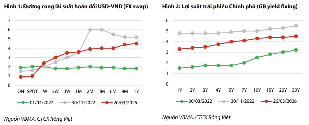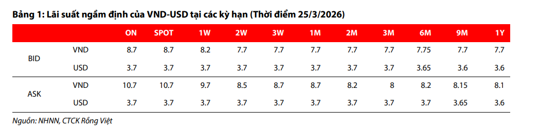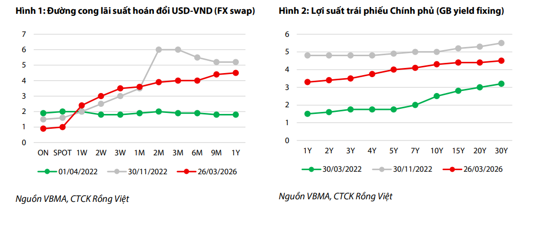 Bên cạnh đó, việc chênh lệnh giữa huy động - tín dụng tiếp tục làm chi phí sử dụng vốn tăng cao. Hoán đổi (swap) lãi suất giữa USD-VND đã lên vùng cao tiệm cận (và tại 1 số kỳ hạn dưới 1 tháng đã vượt) giai đoạn khủng hoảng thanh khoản năm 2022. Việc duy trì swap dương này tuy có lợi ích là kìm hãm đà tăng của tỷ giá nhưng sẽ gây thêm áp lực cho mặt bằng lãi suất huy động.