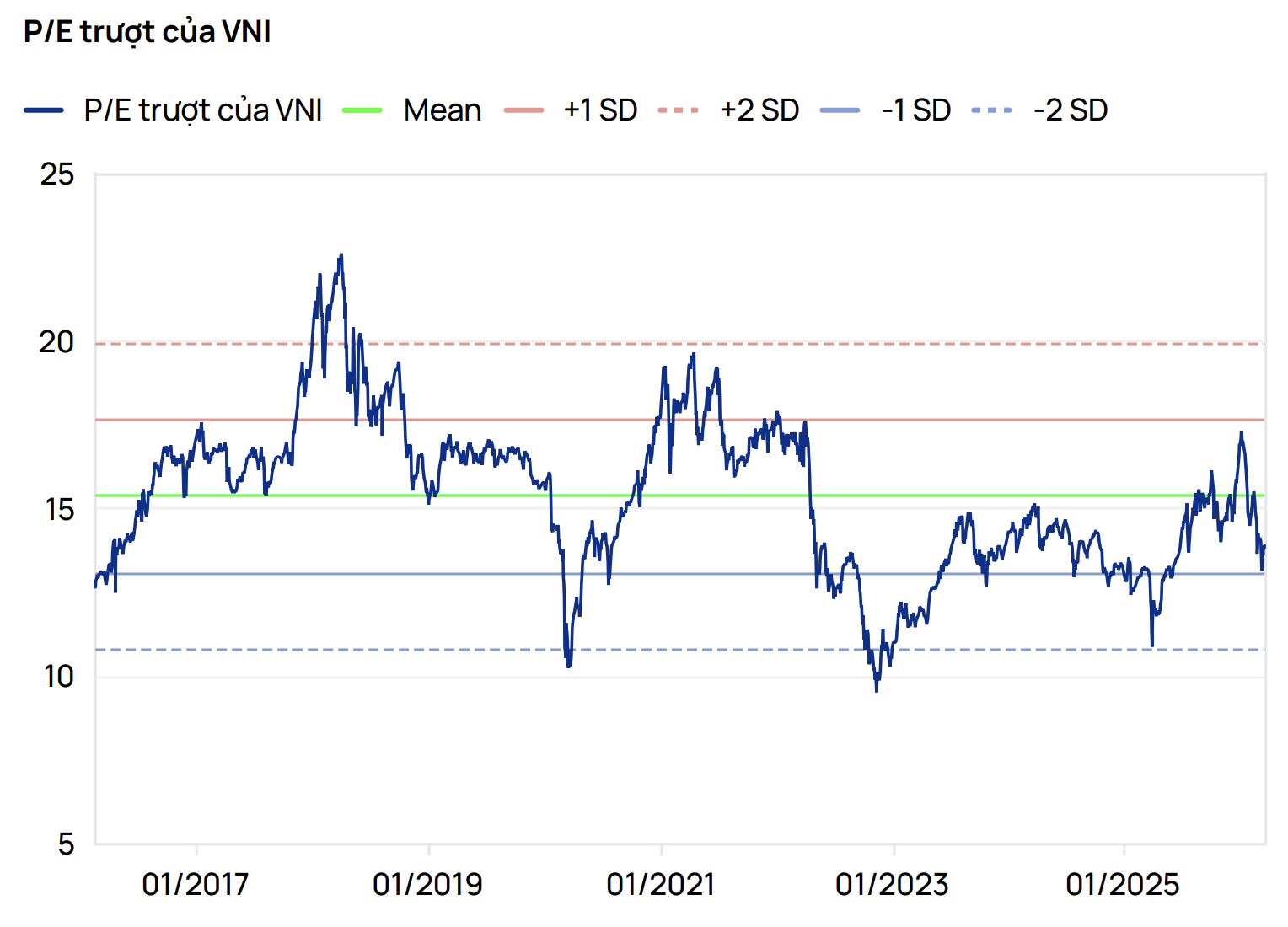 Tuy nhiên, nhịp giảm này đã đưa định giá P/E trượt của VN-Index về mức 15,2x, tiệm cận mức -1 độ lệch chuẩn. Theo Vietcap, đây là mức định giá hấp dẫn trong bối cảnh Chính phủ kiên định mục tiêu tăng trưởng hai con số.