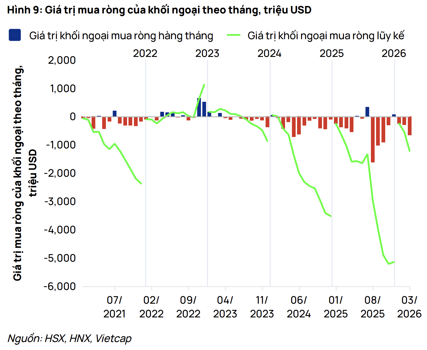 Báo cáo thị trường cập nhật của Chứng khoán Vietcap cho thấy, trong tháng 3, chỉ số VN-Index đóng cửa tại 1.674,5 điểm. Nguyên nhân chính đến từ bất ổn tại Trung Đông khiến eo biển Hormuz đóng cửa, đẩy giá dầu tăng và gây lo ngại lạm phát đình trệ toàn cầu. Khối ngoại đã thực hiện bán ròng kỷ lục 665,3 triệu USD trên toàn thị trường trong tháng này.