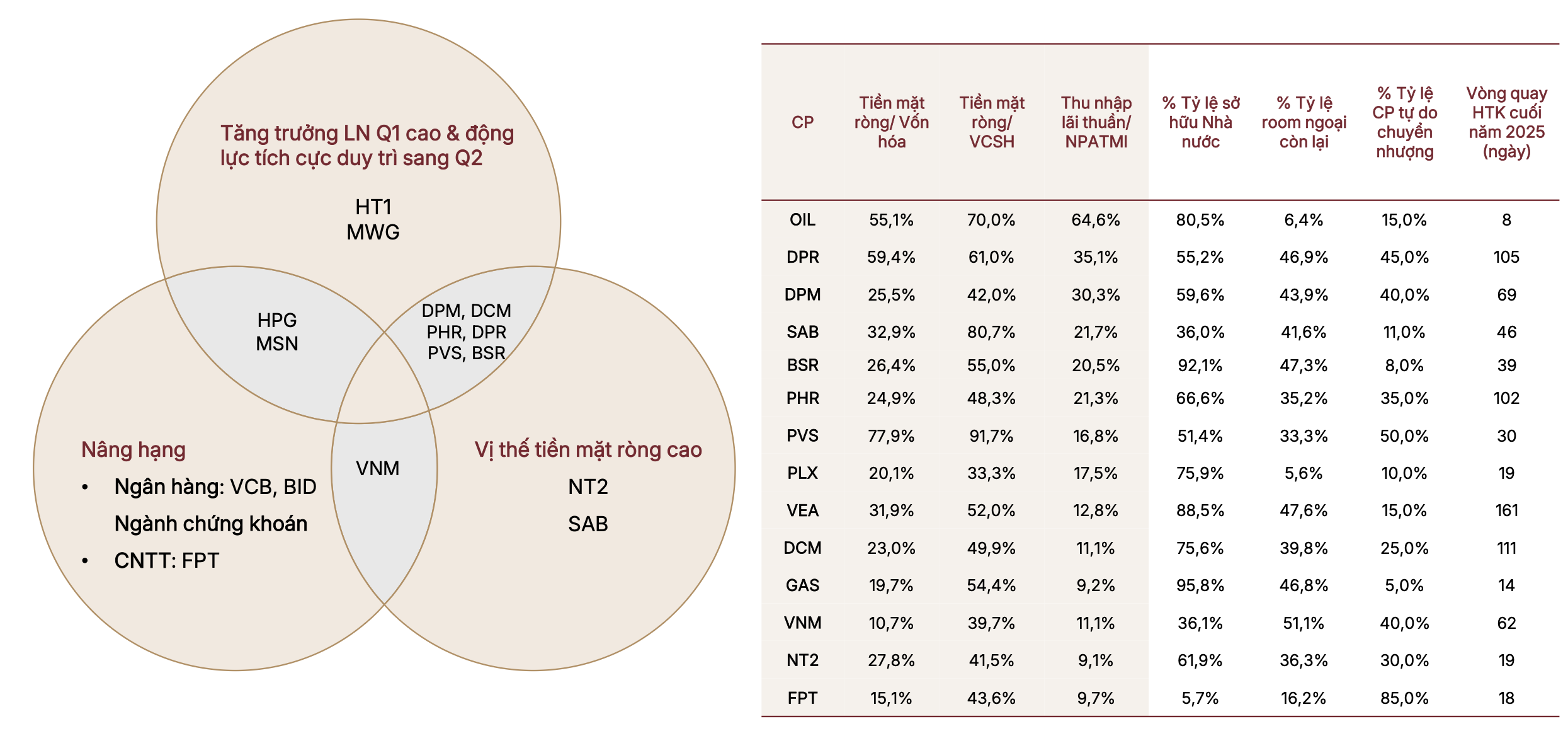 Trong tháng 4, chiến lược đầu tư được khuyến nghị là tập trung vào các doanh nghiệp có tăng trưởng lợi nhuận mạnh trong quý 1/2026, bảng cân đối kế toán lành mạnh với vị thế tiền mặt ròng cao và mức độ hưởng lợi rõ ràng từ dòng vốn liên quan đến nâng hạng. Các cổ phiếu được ưu tiên trong tháng bao gồm HPG, MSN, VCB, FPT, PVT, DPR, VHC và DCM.
