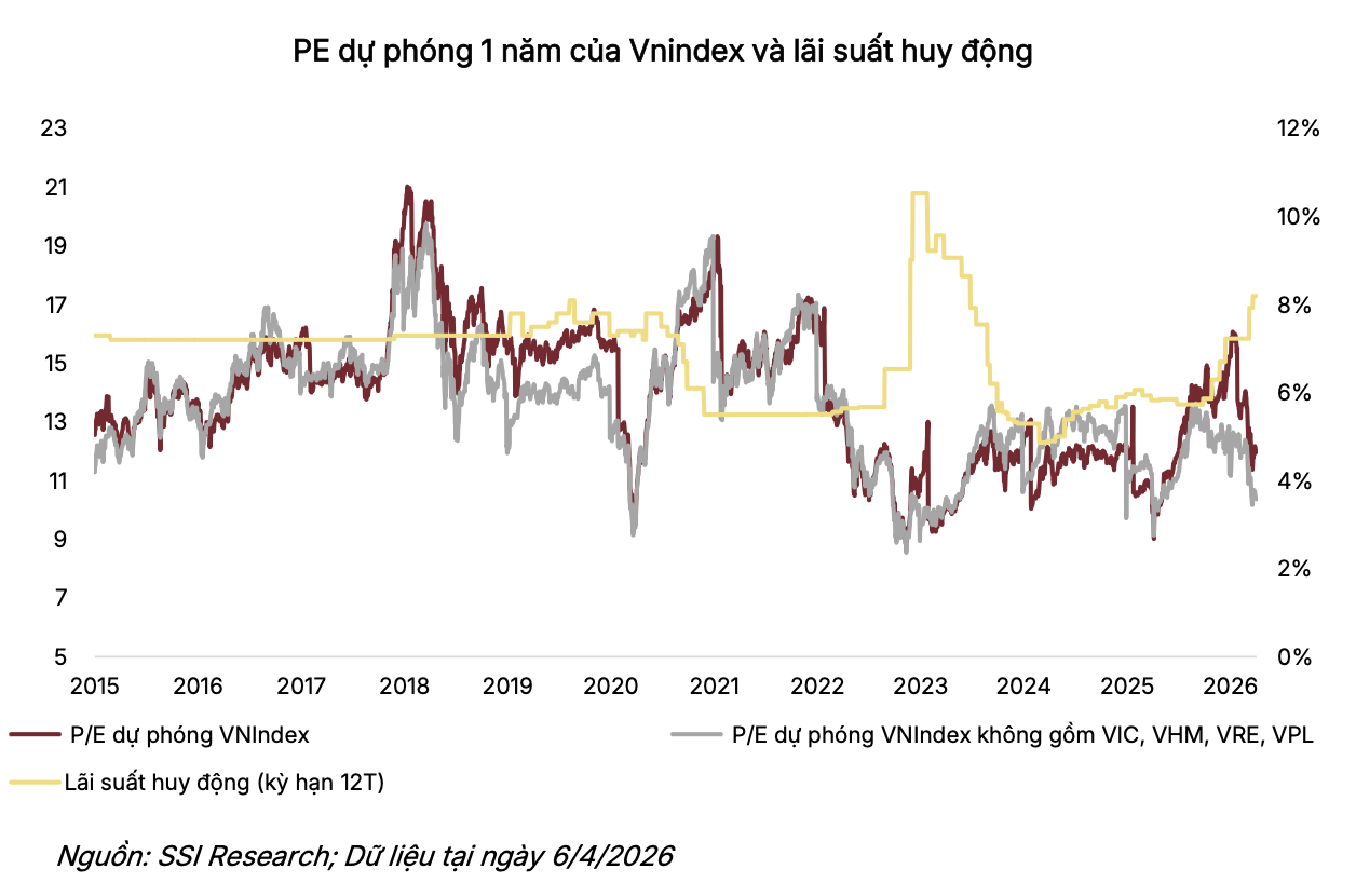 Xét về định giá, tính đến đầu tháng 4/2026, VN-Index đang giao dịch ở mức P/E dự phóng khoảng 12,0x, thấp hơn rõ rệt so với mức trung bình 10 năm là 14,0x. Mặc dù vùng định giá này được đánh giá là tương đối hấp dẫn xét trên nền tảng cơ bản, SSI Research lưu ý rằng rủi ro điều chỉnh trong ngắn hạn vẫn chưa thể loại bỏ hoàn toàn do áp lực lãi suất đang gia tăng.