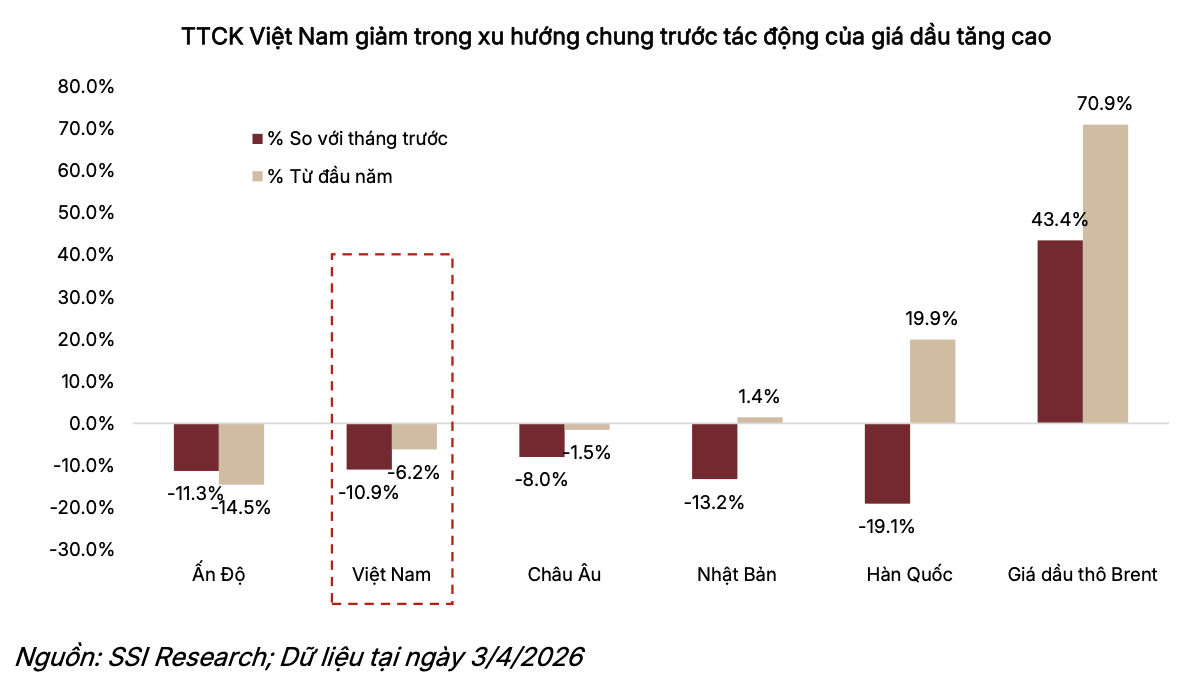 Theo báo cáo chiến lược mới đây của từ SSI Research, thị trường chứng khoán Việt Nam vừa trải qua một nhịp điều chỉnh mạnh trong tháng 3, với VN-Index giảm 10,9% theo tháng xuống 1.674 điểm. Dù chỉ số chạm đáy tại 1.591 điểm, thanh khoản thị trường vẫn duy trì tích cực với giá trị giao dịch bình quân ngày (ADTV) tăng 6,7% so với tháng trước lên 1,15 tỷ USD. Các chuyên gia từ SSI Research nhận định, thị trường đang bước vào giai đoạn tích lũy mang tính phòng thủ.