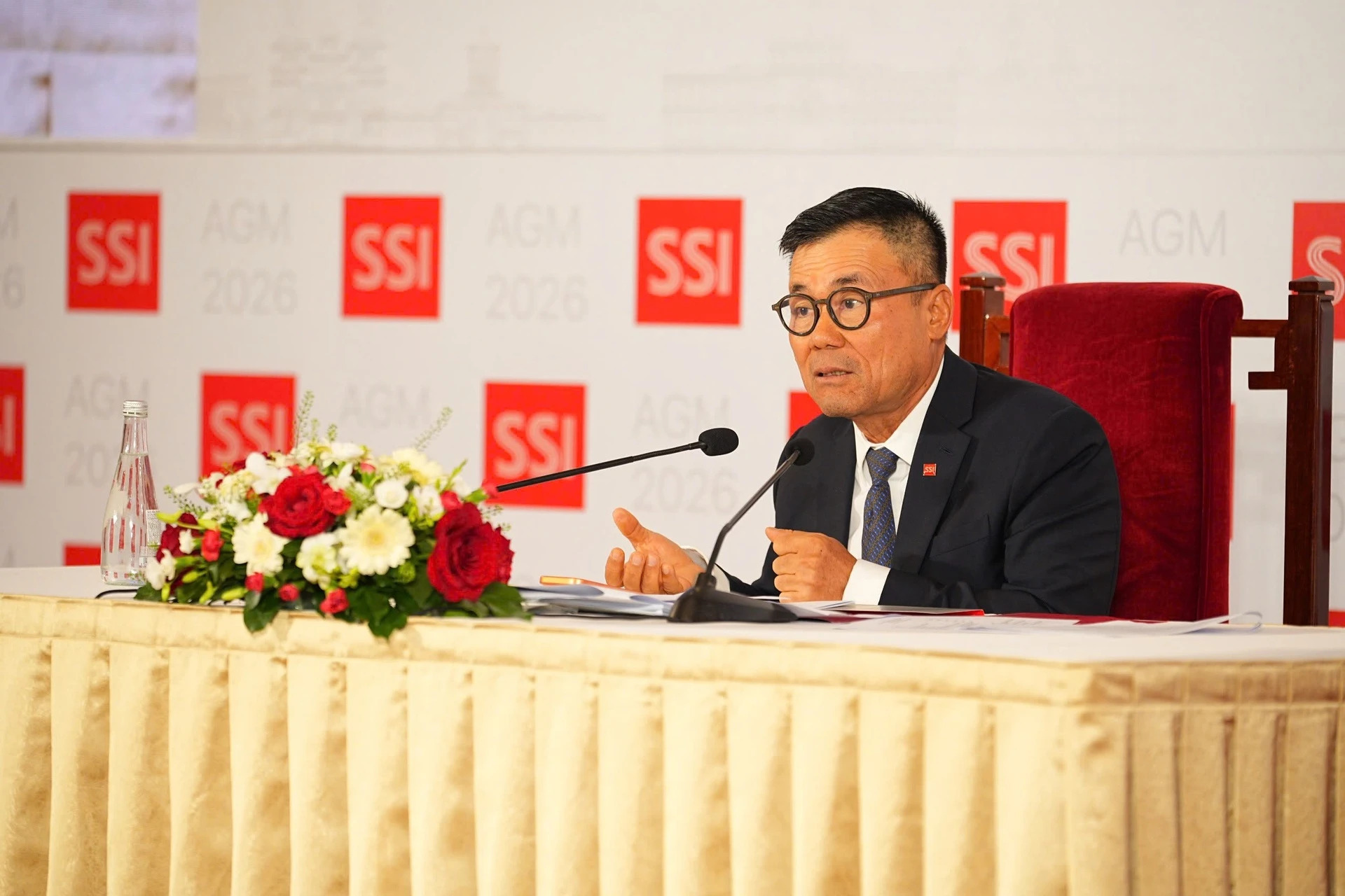Chủ tịch Nguyễn Duy Hưng điều hành đại hội thường niên 2026 của SSI, tổ chức chiều ngày 23/4 tại TP.HCM. Ảnh: TL