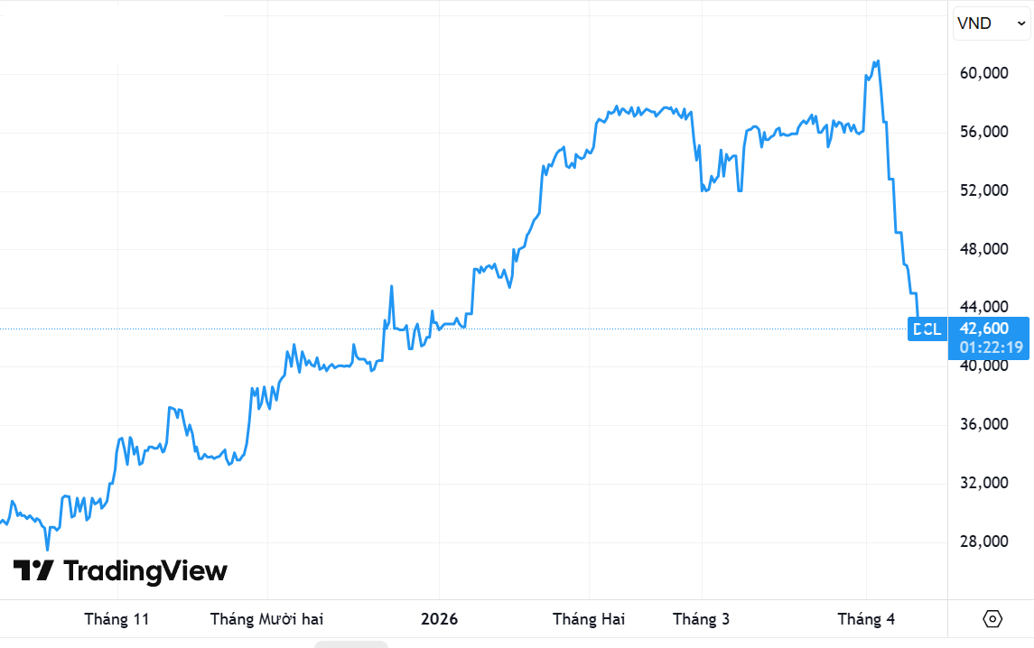 Rộng hơn, mã chứng khoán này đã có đợt tăng giá mạnh từ đầu tháng 10/2025 đầu tháng 4 vừa qua, thị giá cổ phiếu DCL đã tăng hơn 100% từ vùng 30.000 đồng/cp và đạt đỉnh lại vùng 62.000 đồng/cp. Sau đó, áp lực chốt lời nhanh chóng xuất hiện và chuyển thành làn sóng bán tháo mạnh mẽ. Diễn biến này không phải hiếm trên thị trường, đặc biệt với những cổ phiếu đã tăng “nóng” trong thời gian ngắn.