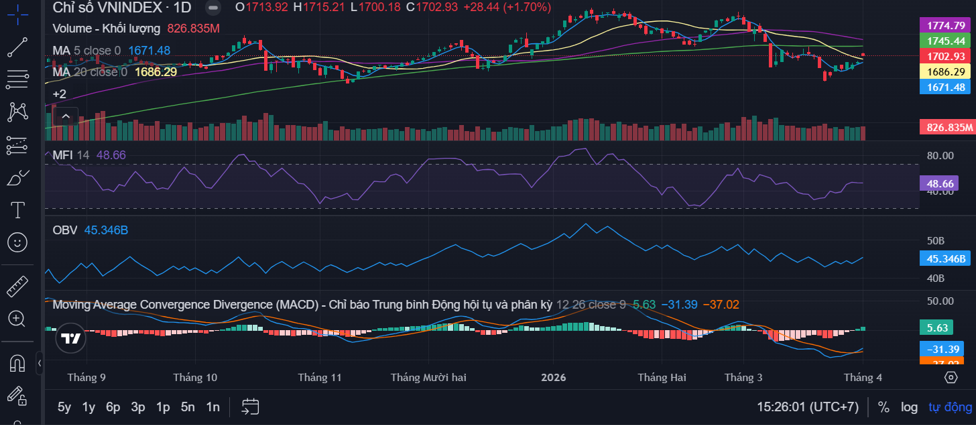 Về xu hướng kỹ thuật, sau khi vượt MA5 ở các phiên trước, VN-Index đã vượt ngưỡng kháng cự MA20 và có xu hướng tiến đến vùng kháng cự mạnh MA50 ở 1.745 điểm, tuy nhiên, VN-Index kết thúc phiên với cây nến đỏ cho thấy đây chỉ là nhịp hồi ngắn hạn chứ chưa xác nhận uptrend trở lại. Đường MACD đã cắt lên, histogram xanh trở lại cho thấy có tín hiệu hồi nhưng không mạnh, MFI ở 48 xác nhận dòng tiền chưa vào.