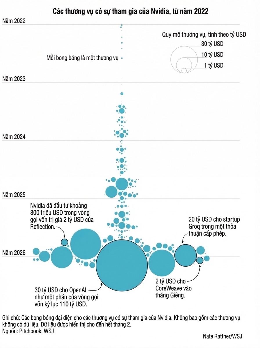 Nhờ nhu cầu khổng lồ với chip do sự bùng nổ của AI toàn cầu, Nvidia sinh lời nhiều hơn hầu hết công ty niêm yết trên thế giới. Công ty có giá trị vốn hóa lớn nhất thế giới đã sử dụng nguồn vốn tăng nhanh của mình để trở thành nhà tài chính quyền lực nhất trong ngành, đầu tư hàng chục tỷ USD vào các startup triển vọng và hỗ trợ những khách hàng quan trọng khó có khả năng tự chi trả chi phí chip đắt đỏ.