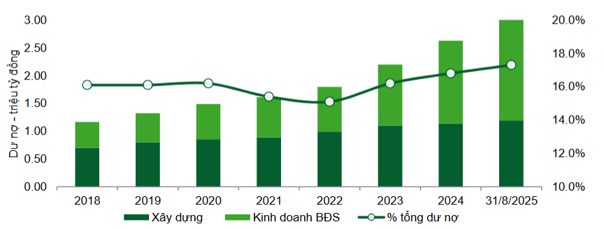 Theo báo cáo của Chứng khoán Vietcombank (VCBS), dữ liệu tính đến cuối tháng 8 năm 2025, dư nợ cho vay Kinh doanh Bất động sản và Xây dựng trên hệ thống đạt 2,94 triệu tỷ đồng, tăng 17,9% so với đầu năm và chiếm khoảng 17% dư nợ hệ thống, con số cao nhất trong nhiều năm trở lại đây.