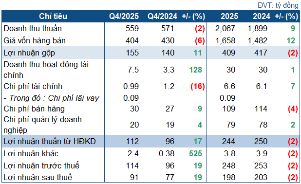 Quý 4/2025, DMC đạt doanh thu thuần hơn 559 tỷ đồng, giảm nhẹ 2% so với cùng kỳ năm trước. Giá vốn giảm hơn 6%, nhờ đó Doanh nghiệp lãi gộp 155 tỷ đồng, tăng 11%. Biên lợi nhuận gộp được cải thiện đáng kể, từ mức 24.6% cùng kỳ lên 27.7%.