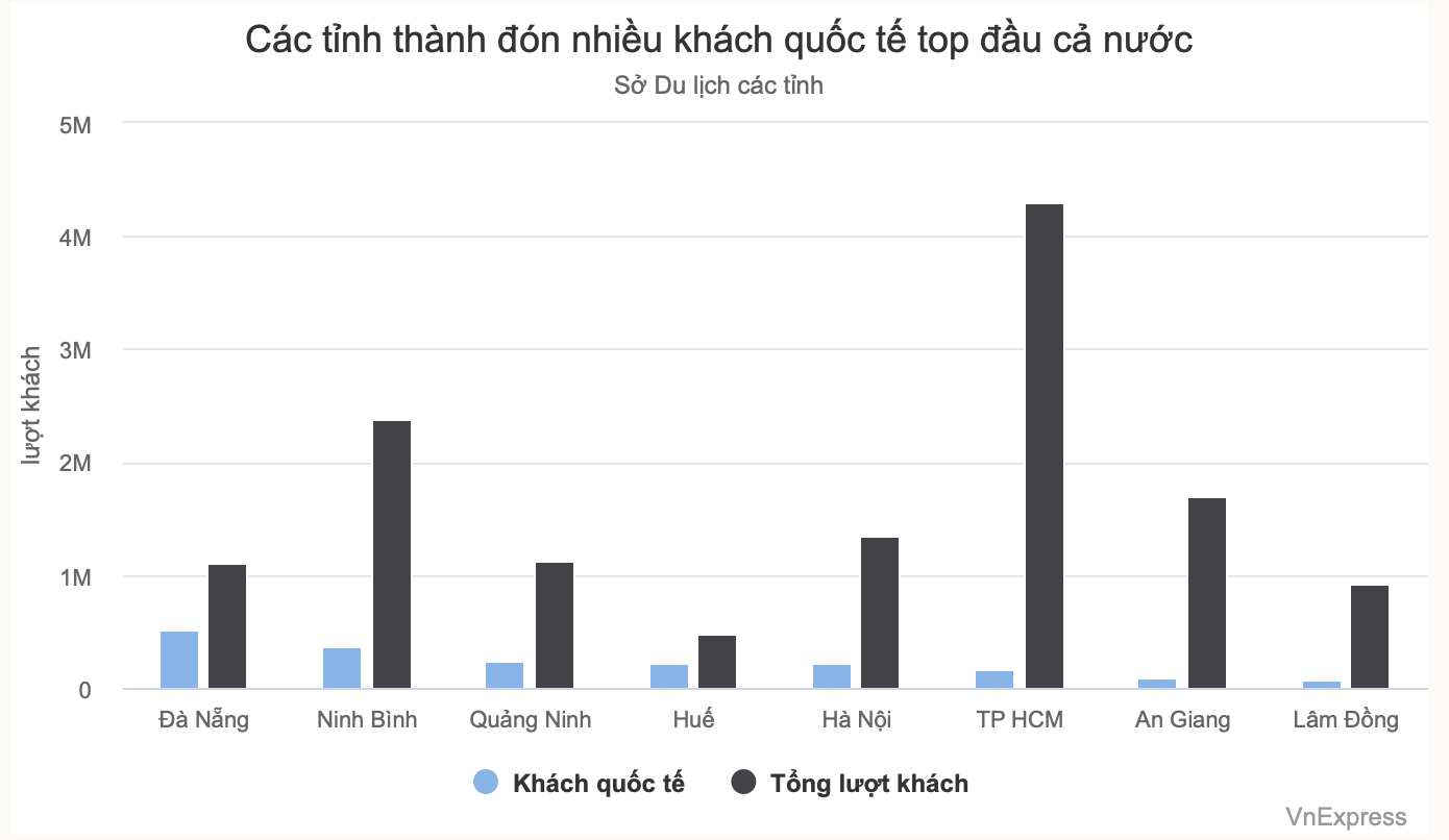 Tại Đà Nẵng, khách quốc tế đạt 510.000 lượt, chiếm gần 50% trong tổng 1,1 triệu lượt. Huế cũng chiếm tỷ lệ tương tự khi đón 240.000 lượt khách quốc tế trong tổng hơn 480.000 lượt. Các tỉnh thành khác cũng đón lượng khách quốc tế cao gồm TP HCM, Ninh Bình, Hà Nội.