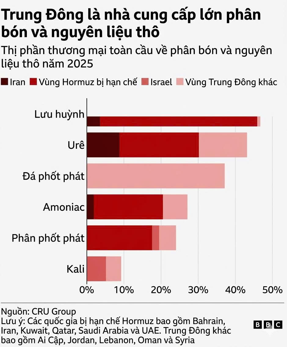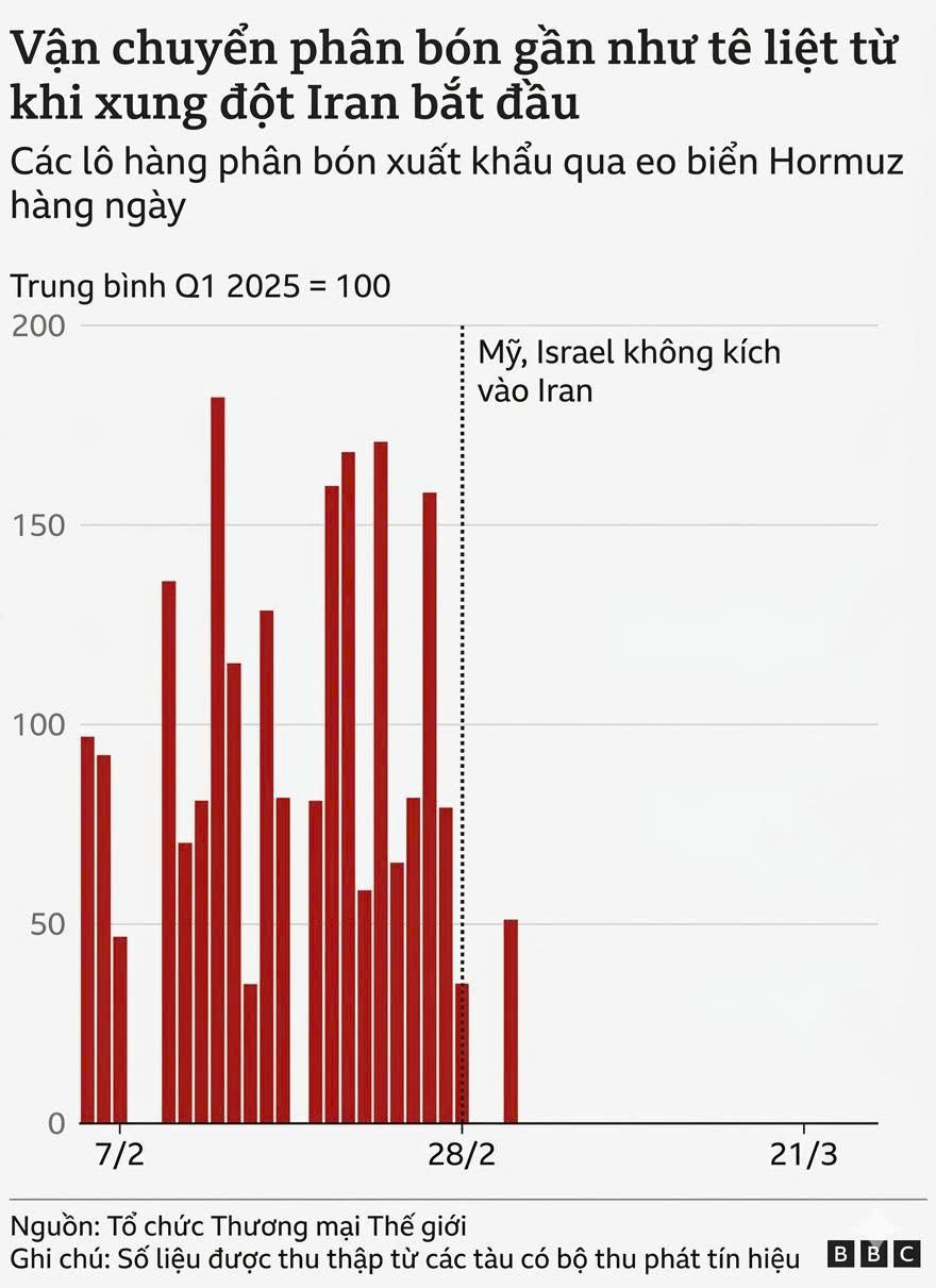 Dữ liệu từ Tổ chức Thương mại Thế giới (WTO) cho thấy, kể từ khi xung đột bắt đầu, lượng hàng hóa liên quan đến phân bón xuất khẩu qua tuyến đường thủy huyết mạch này sụt giảm nghiêm trọng.