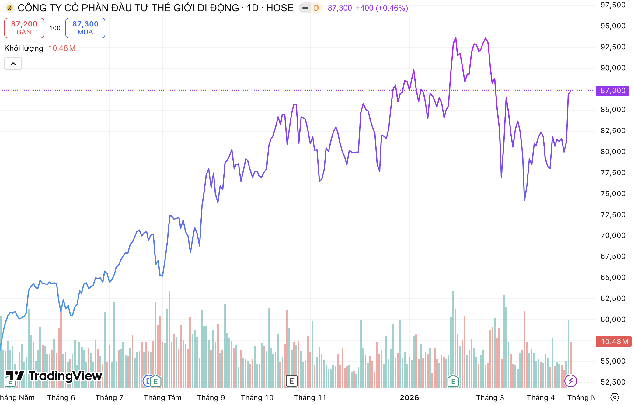 Thị giá MWG dù điều chỉnh 6% từ đỉnh ngắn hạn nhưng vẫn hơn gấp rưỡi sau 1 năm. Ảnh: TradingView