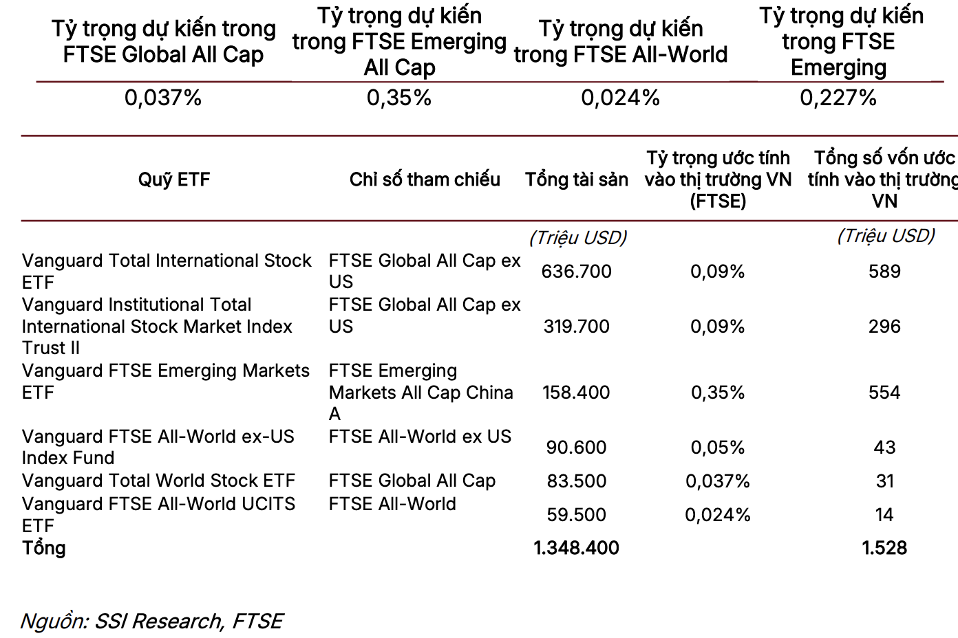 SSI Research ước tính dòng vốn thụ động từ các quỹ ETF theo dõi chỉ số FTSE sẽ vào Việt Nam khoảng 1,53 tỷ USD, không chênh lệch quá nhiều so với các ước tính trước đó. Theo Giám đốc SSI Research, việc FTSE xác nhận lộ trình nâng hạng không chỉ mang ý nghĩa về mặt dòng vốn, mà còn là dấu mốc quan trọng trong quá trình chuẩn hóa thị trường chứng khoán Việt Nam theo các tiêu chuẩn quốc tế, đặc biệt liên quan đến khả năng tiếp cận của nhà đầu tư nước ngoài và hạ tầng giao dịch.