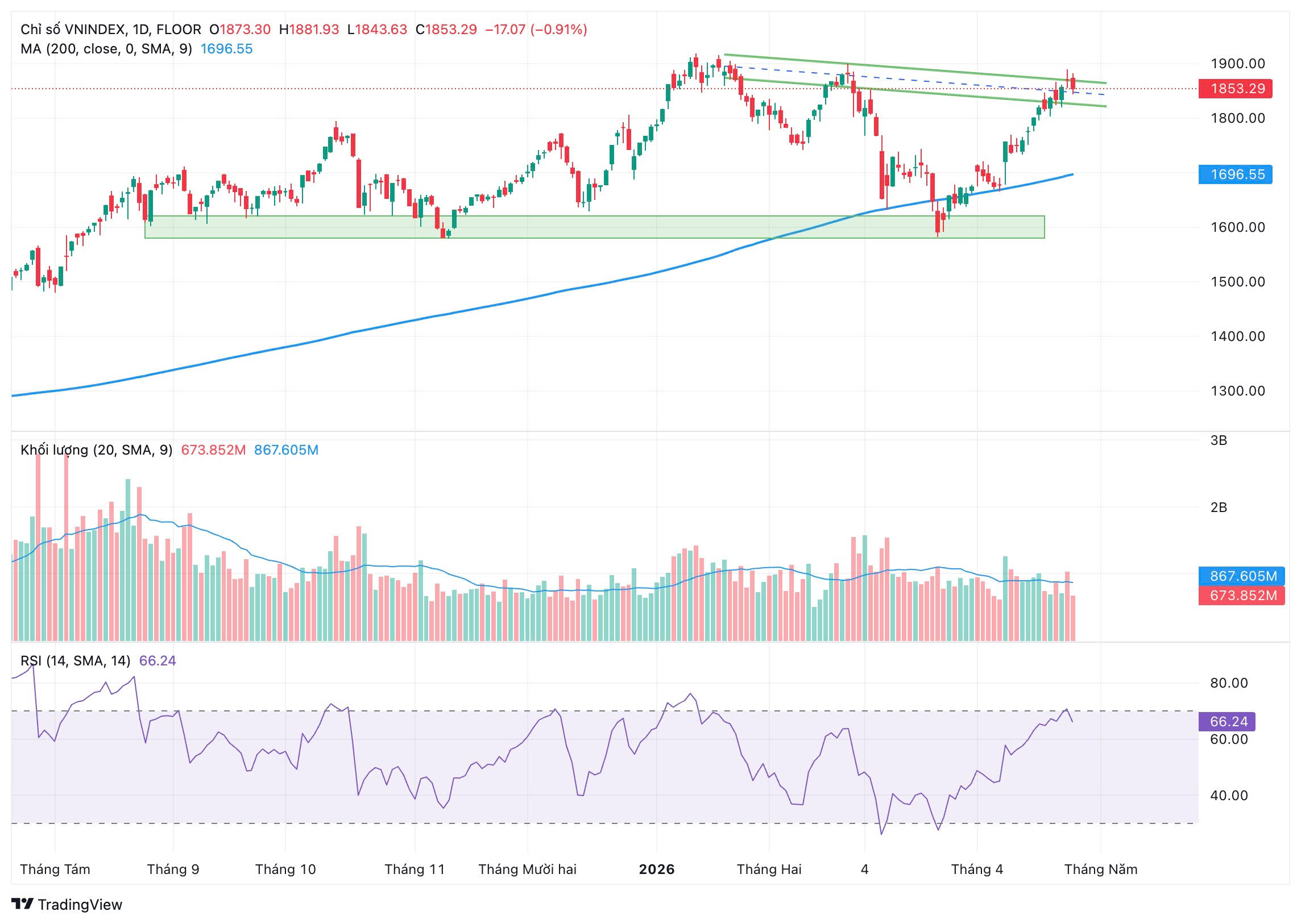 Xu hướng của chỉ số đang suy yếu nhưng chưa xác nhận đỉnh. Nguồn: Trading View/ VTV Index