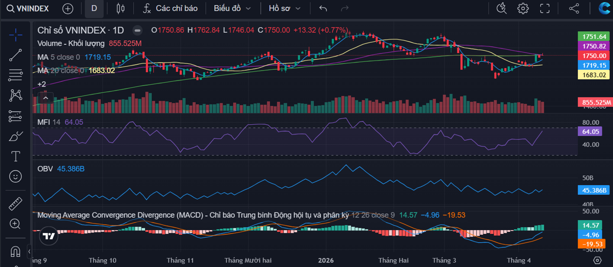 VN-Index đóng cách xa mốc MA20 tại 1.683 điểm và đang test lại vùng kháng cự ngắn ở 1.750-1.760 điểm, MACD đã cắt lên, chỉ số MFI đóng tại 64 cho thấy tiền vào thật nhưng chỉ số OBV chưa cắt qua đỉnh cũ thì chưa có sóng mạnh, theo đó, nhịp hiện tại vẫn là pha hồi kết hợp với tích lũy nâng nền giá.