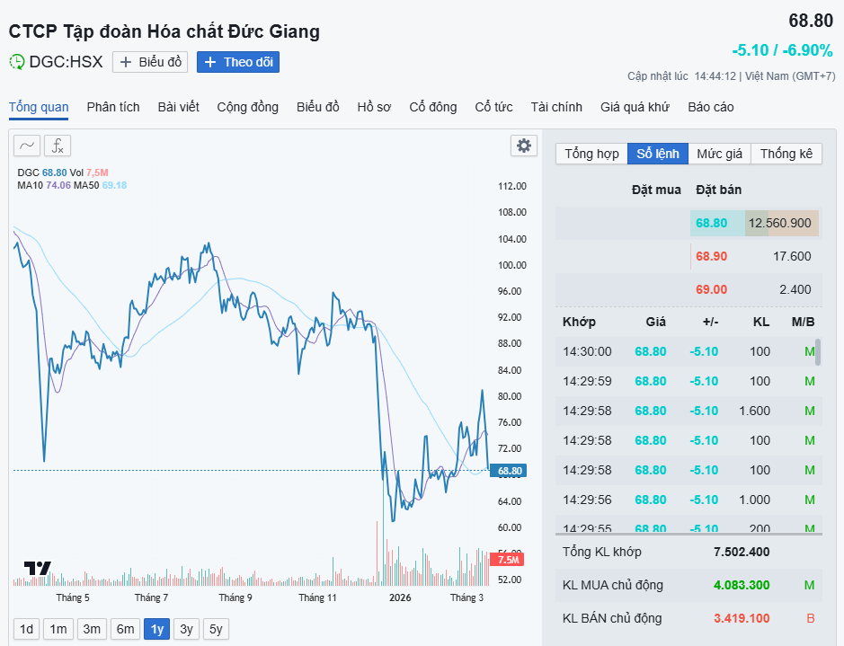 Thông tin về khởi tố vụ án liên quan đến các sai phạm tại Hóa chất Đức Giang lập tức phản ánh lên thị trường khi cổ phiếu DGC giảm hết biên độ, xuống 68.800 đồng/cp, với dư bán giá sàn tới hơn 12.5 triệu cổ phiếu tính đến 14h45 ngày 17/03/2026. Trong một năm qua, thị giá cổ phiếu này đã giảm hơn 1/3 giá trị.