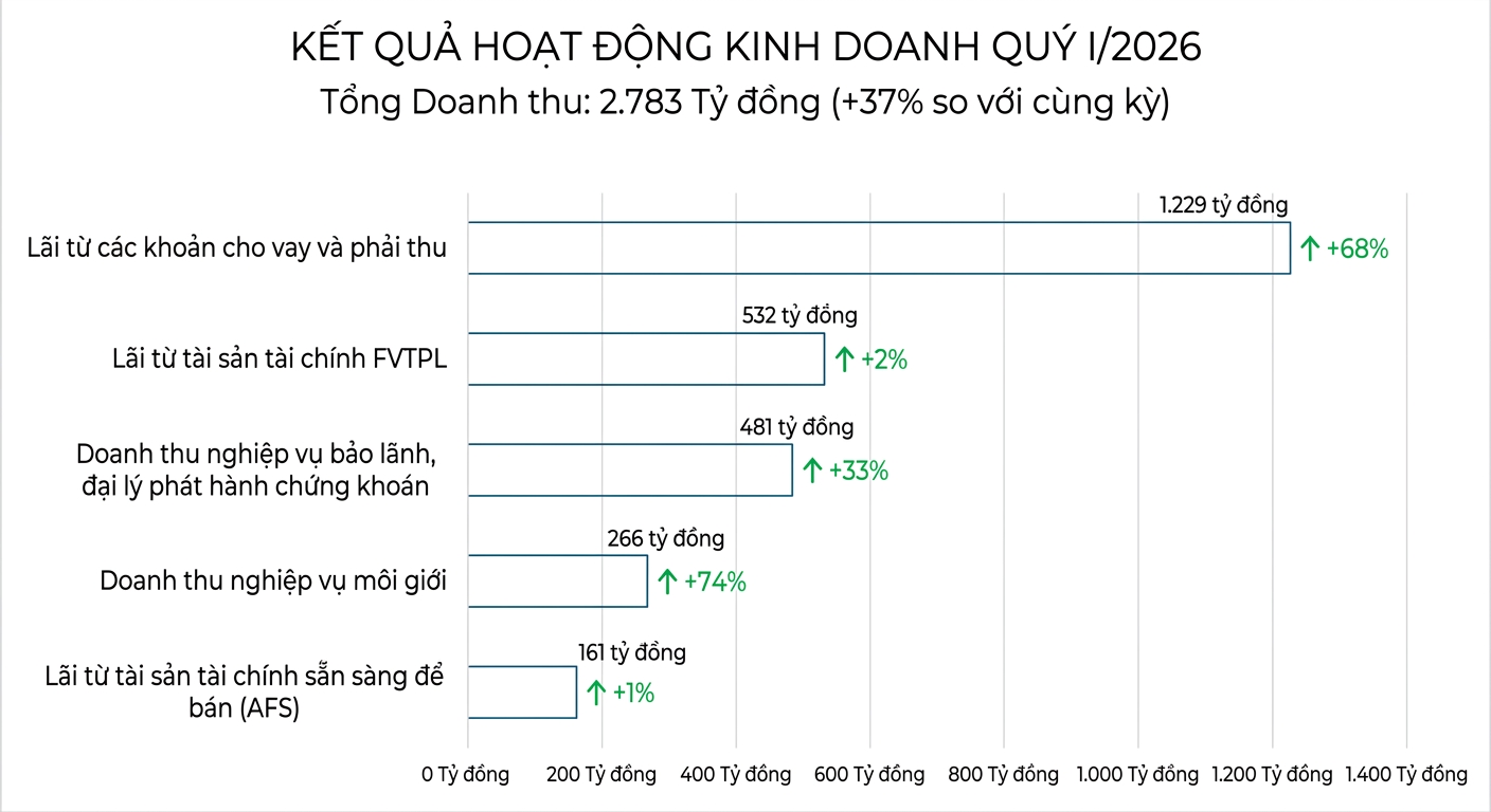 Mảng cho vay ký quỹ và ứng trước tiền bán tiếp tục là động lực tăng trưởng chủ lực, với thu nhập đạt 1.211 tỷ đồng trong quý 1/2026, tăng 69% so với cùng kỳ và đóng góp 52% tổng thu nhập thuần.