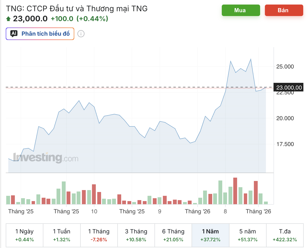 Trên thị trường, cổ phiếu TNG giao dịch quanh mức 23.000 đồng/cổ phiếu trong phiên chiều 14/4. Giá cổ phiếu điều chỉnh khoảng 7% trong tháng gần nhất, nhưng vẫn tăng khoảng 38% trong vòng một năm qua. Thanh khoản bình quân đạt gần 1,6 triệu cổ phiếu mỗi phiên.