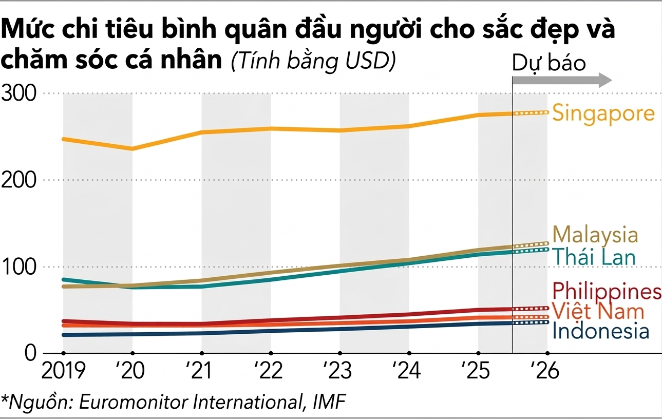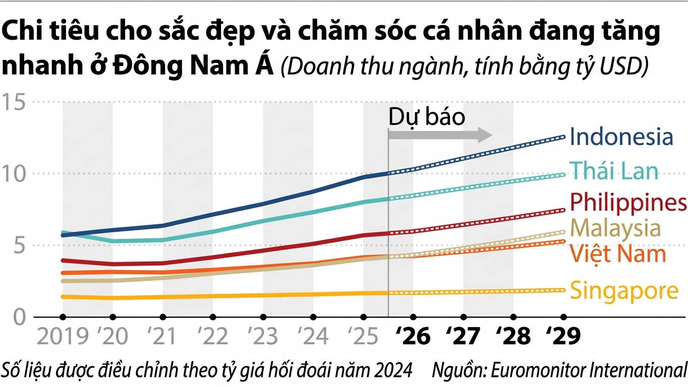 Năm ngoái, doanh số bán mỹ phẩm và chăm sóc cá nhân ở Đông Nam Á ghi nhận mức tăng trưởng hai con số ở hầu hết quốc gia, vượt xa tốc độ tăng trưởng tổng sản phẩm quốc nội (GDP). Ví dụ, GDP của Thái Lan chỉ tăng trưởng ở mức khiêm tốn 2,4% năm 2025, trong khi ngành làm đẹp của nước này tăng trưởng 9,4%, theo ông ty nghiên cứu thị trường Euromonitor International. Malaysia có tốc độ tăng trưởng cao nhất khu vực trong ngành mỹ phẩm và chăm sóc cá nhân ở mức 11,8%, gấp đôi tốc độ tăng trưởng GDP 5,2% của cả nước.
