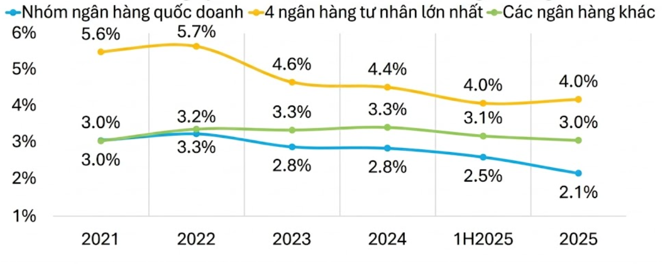 Dù tỷ lệ nợ xấu (NPL) toàn ngành duy trì ổn định ở mức 1,9% trong năm 2025, báo cáo chỉ ra rằng sự ổn định này chủ yếu đạt được nhờ vào các hoạt động xóa nợ tích cực và tăng trưởng tín dụng nhanh, thay vì cải thiện tự thân.