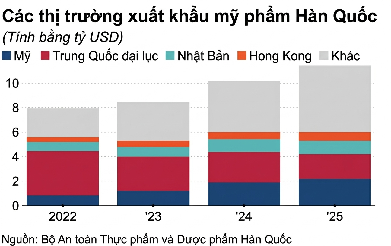Theo Bộ An toàn Thực phẩm và Dược phẩm Hàn Quốc, xuất khẩu các sản phẩm K-beauty sang Mỹ đã tăng hơn gấp đôi, từ 841 triệu USD vào năm 2021 lên 2,2 tỷ USD vào năm 2025. Trong khi đó, các lô hàng sang Trung Quốc, vốn là quốc gia nhập khẩu hàng đầu, đã giảm hơn một nửa, từ khoảng 4,8 tỷ USD xuống còn 2 tỷ USD.