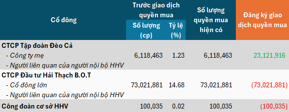 Cụ thể, CTCP Đầu tư Hải Thạch B.O.T - cổ đông lớn nắm giữ hơn 73 triệu cp HHV (tỷ lệ 14.68%) - muốn chuyển nhượng toàn bộ hơn 73 triệu quyền mua hiện có. Tương tự, Công đoàn cơ sở HHV muốn chuyển nhượng hết hơn 100 ngàn quyền mua. Thời gian thực hiện đều từ ngày 28-30/01.