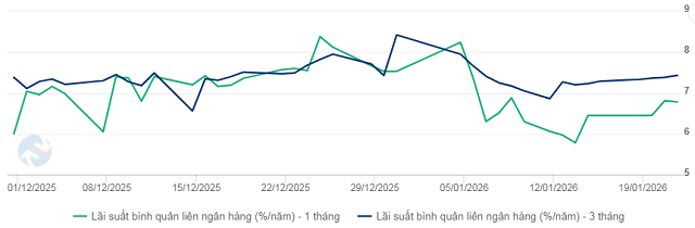 Ngược lại, kỳ hạn 1 tháng và 3 tháng tăng nhẹ, tăng 33 và 14 điểm cơ bản, lên 6.78% và 7.43%.