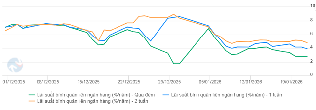 Lãi suất trên thị trường liên ngân hàng ghi nhận diễn biến phân hóa theo kỳ hạn. Lãi suất qua đêm giảm mạnh 98 điểm cơ bản so với cuối tuần trước, còn 2.81%. Kỳ hạn 1 tuần và 2 tuần cũng lần lượt giảm 33 và 10 điểm cơ bản, về 3.92% và 4.81%.