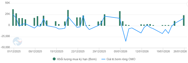 Trong tuần, NHNN hút ròng 24,054 tỷ đồng, đánh dấu tuần rút bớt thanh khoản thứ 3 liên tiếp. Trên kênh OMO, NHNN chỉ phát hành mới 41,591 tỷ đồng hợp đồng mua kỳ hạn 7-91 ngày với lãi suất 4.5%/năm, trong khi có 65,645 tỷ đồng đáo hạn quay trở lại NHNN. Tính đến ngày 26/01, khối lượng lưu hành OMO giảm xuống còn 248,415 tỷ đồng.