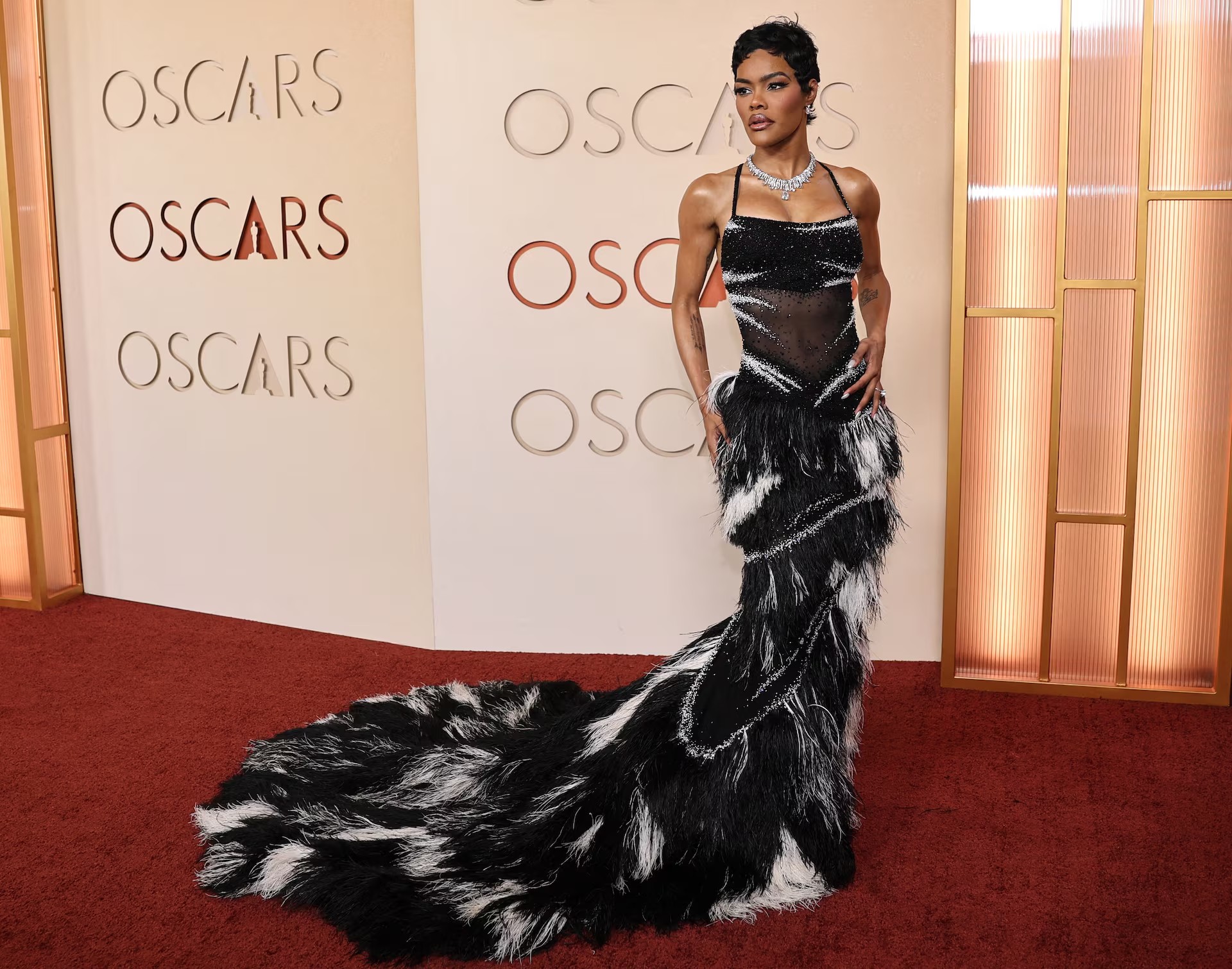 Teyana Taylor đã giành giải Quả cầu vàng cho Nữ diễn viên phụ xuất sắc nhất khi diện chiếc váy Schiaparelli mà cô cho rằng đã giúp cô “có cảm giác và trông giống như một bức tượng”. Còn tại lễ trao giải Oscar, cô chọn Chanel, một thương hiệu đang gây tiếng vang lớn trong làng thời trang nhờ nhà thiết kế mới Matthieu Blazy – và chiếc váy này ít mang dáng dấp bức tượng hơn và khiến tôn lên vóc dáng nổi bật của nữ ca sĩ kiêm diễn viên sinh năm 1990 này. Ảnh: Reuters.