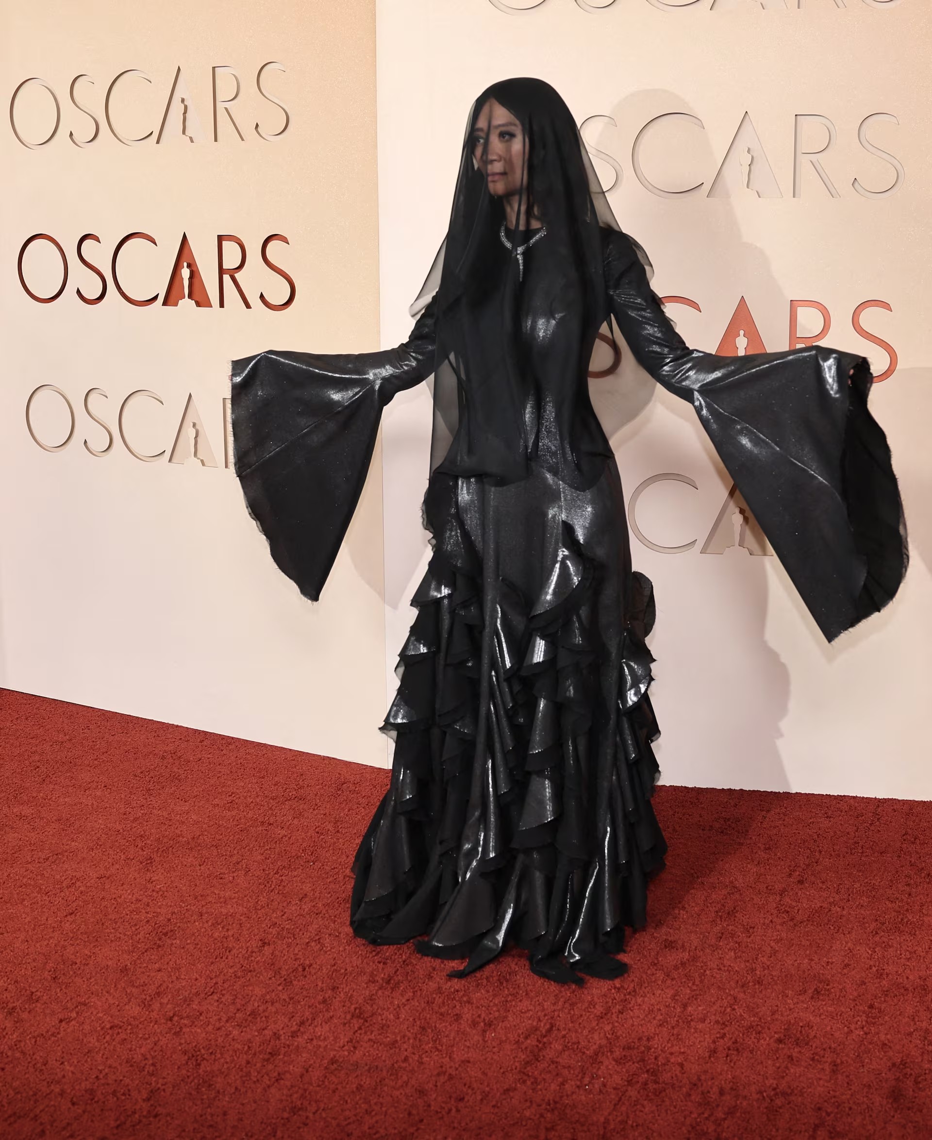 Chloé Zhao từng xuất hiện với những trang phục thảm đỏ rất ấn tượng trước đó – cô diện giày thể thao, tóc buộc hai bím và mặc chiếc váy Hermes đơn giản đến lễ trao giải Oscar năm 2021, khi cô đoạt giải Đạo diễn xuất sắc. Lần này, cô chọn một phong cách khác – kết hợp tất cả yếu tố đặc trưng của phong cách Gothic: nhiều lớp áo đen bóng, tay áo rộng và mạng che mặt. Không biết nữ đạo diễn sẽ chọn phong cách nào tiếp theo. Ảnh: Reuters.