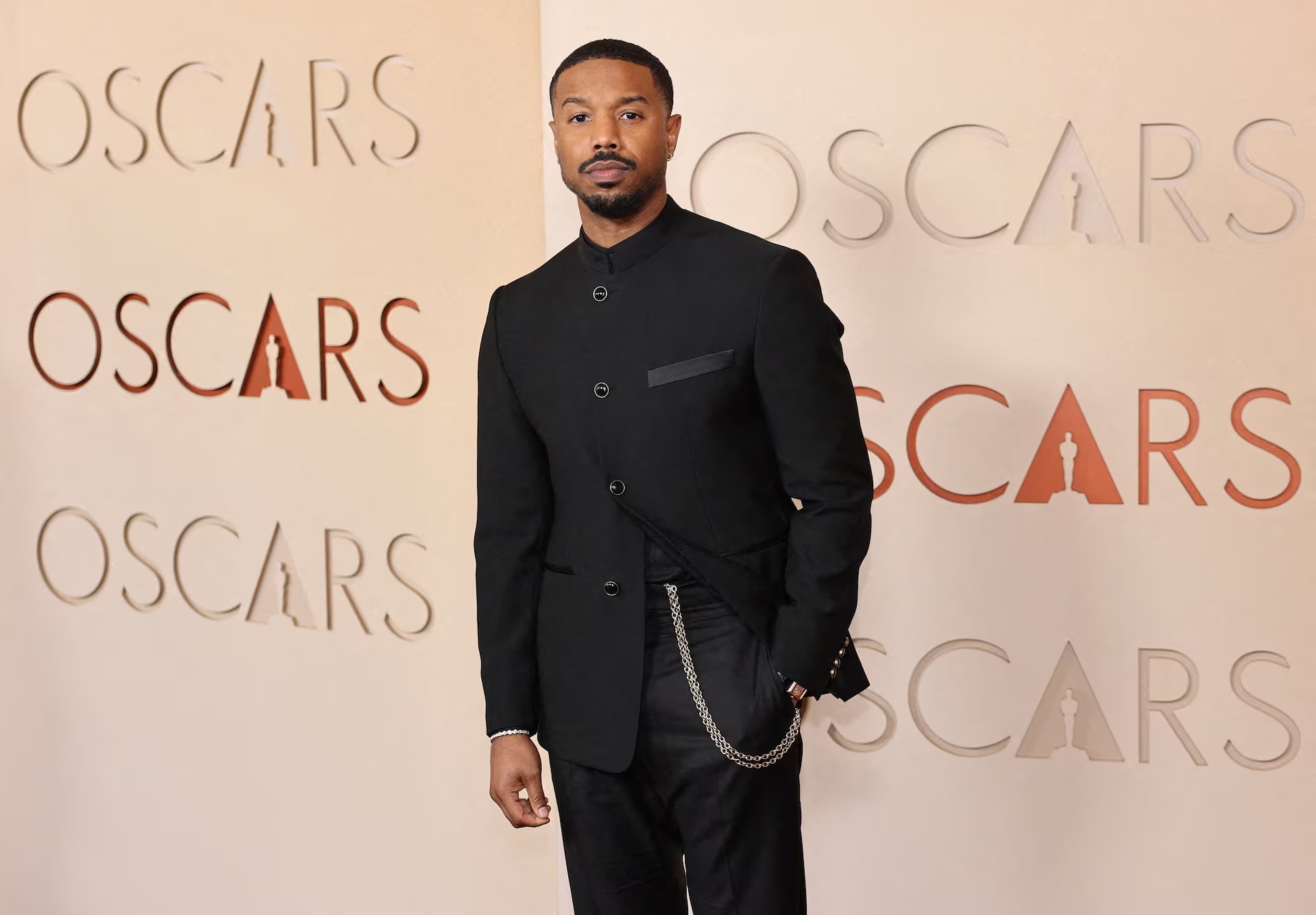 Michael B. Jordan lịch lãm trong bộ vest đen Louis Vuitton với cổ áo Nehru và dây xích ngang eo. Phong cách giản dị nhưng vẫn có điểm nhấn thú vị, còn gì cần hơn thế nữa? Ảnh: Reuters.