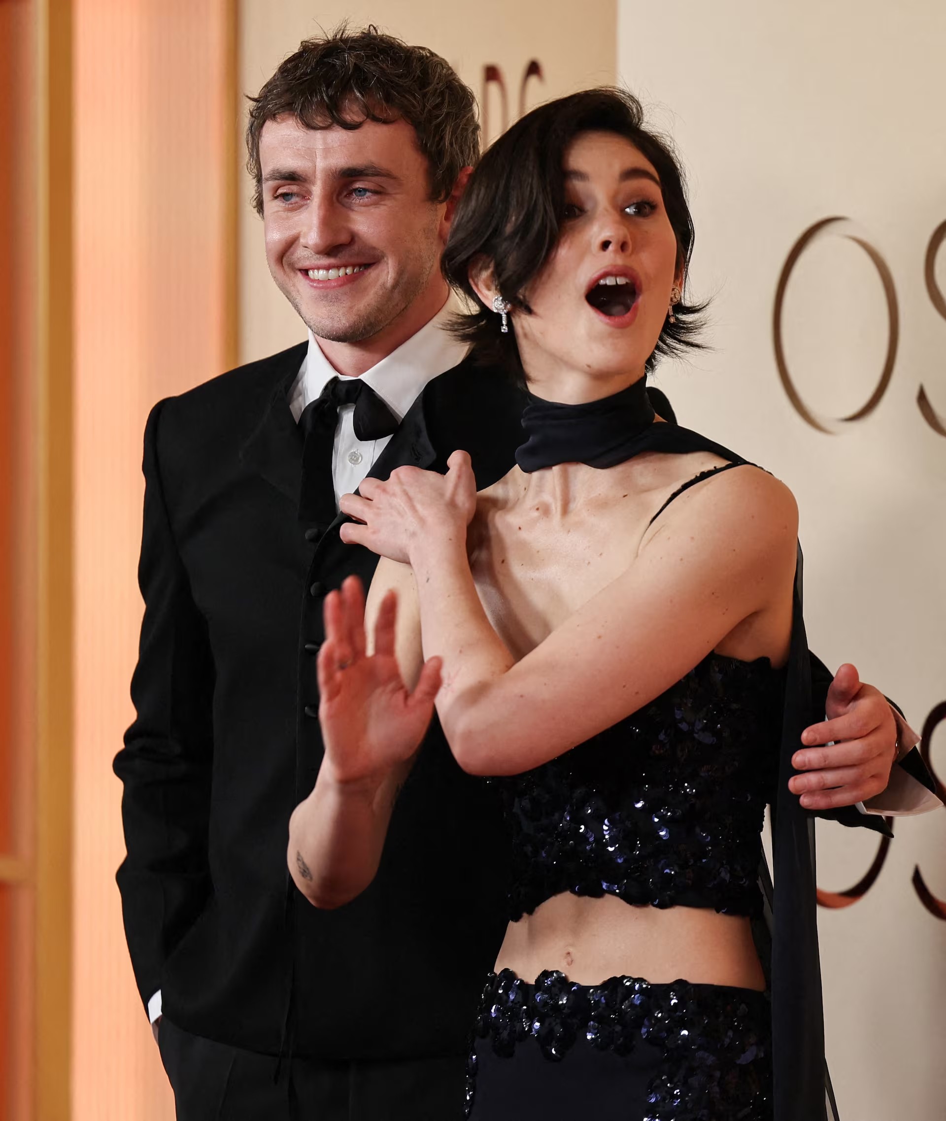 Paul Mescal diện áo khoác len cashmere của Celine với cà vạt bolo nhỏ, và Gracie Abrams trong thiết kế của Chanel. Ảnh: Reuters.