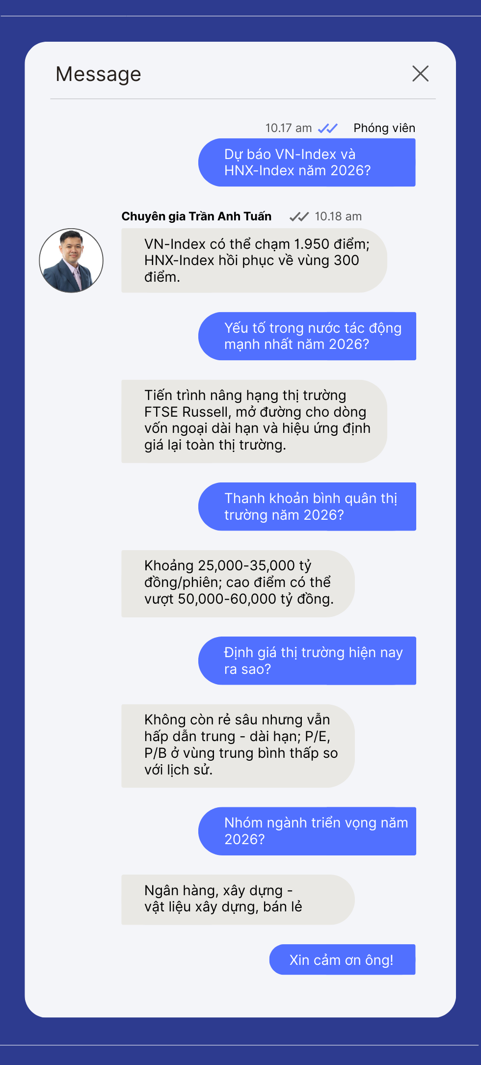 Ông Trần Anh Tuấn: Tôi nhìn nhận năm 2026 là một năm bản lề - khi thị trường chứng khoán Việt Nam không chỉ có cơ hội bứt phá về điểm số mà còn bước vào giai đoạn tái định vị về chất lượng và cấu trúc dòng vốn. Xu hướng chủ đạo nhiều khả năng vẫn là tăng trưởng đi kèm phân hóa rõ rệt: mặt bằng chỉ số được nâng lên, nhưng cơ hội sinh lời sẽ tập trung vào những doanh nghiệp có nền tảng thực sự tốt, thay vì tăng đồng loạt như các chu kỳ nghiêng về đầu cơ trước đây.