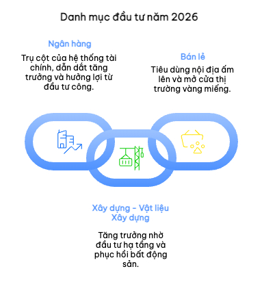 - Nếu chọn 3 nhóm ngành tiềm năng nhất cho năm 2026, tôi ưu tiên ngân hàng, xây dựng - vật liệu xây dựng và bán lẻ. Ngân hàng tiếp tục là trụ cột của hệ thống tài chính và thường dẫn dắt mỗi chu kỳ tăng mới. Tín dụng năm 2026 được dự báo tăng 18-20%, hưởng lợi từ đầu tư công, sự phục hồi của bất động sản và các chỉ đạo hỗ trợ sản xuất - kinh doanh, đồng thời là nhóm hưởng lợi trực tiếp khi thị trường được nâng hạng. Đây nên là nhóm chiếm tỷ trọng lớn nhất trong danh mục dài hạn.