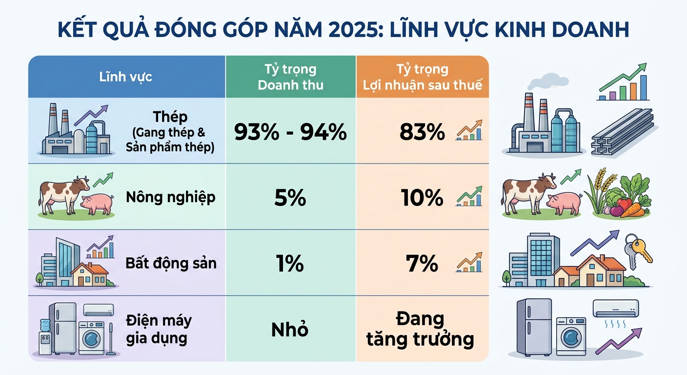 Lĩnh vực thép tiếp tục đóng vai trò cốt lõi khi chiếm 93% doanh thu. Sản lượng bán hàng lần đầu vượt 10 triệu tấn, tăng 25%, trong đó thép cuộn cán nóng (HRC) tăng trên 70%.