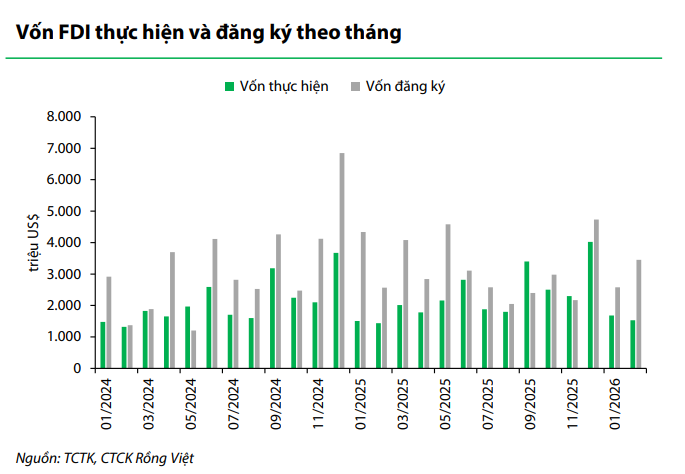 Vốn FDI thực hiện trong 2 tháng đầu năm 2026 đạt 3,21 tỷ USD, tăng 8,8% so với cùng kỳ, cho thấy tiến độ giải ngân của các dự án hiện hữu vẫn tích cực. Trong khi đó, giải ngân đầu tư công chỉ đạt 55.739,8 tỷ đồng, tương đương 5,6% kế hoạch năm, cho thấy động lực từ khu vực công vẫn chậm phát huy và chưa tạo được lực đẩy đủ mạnh cho tổng cầu trong quý I.