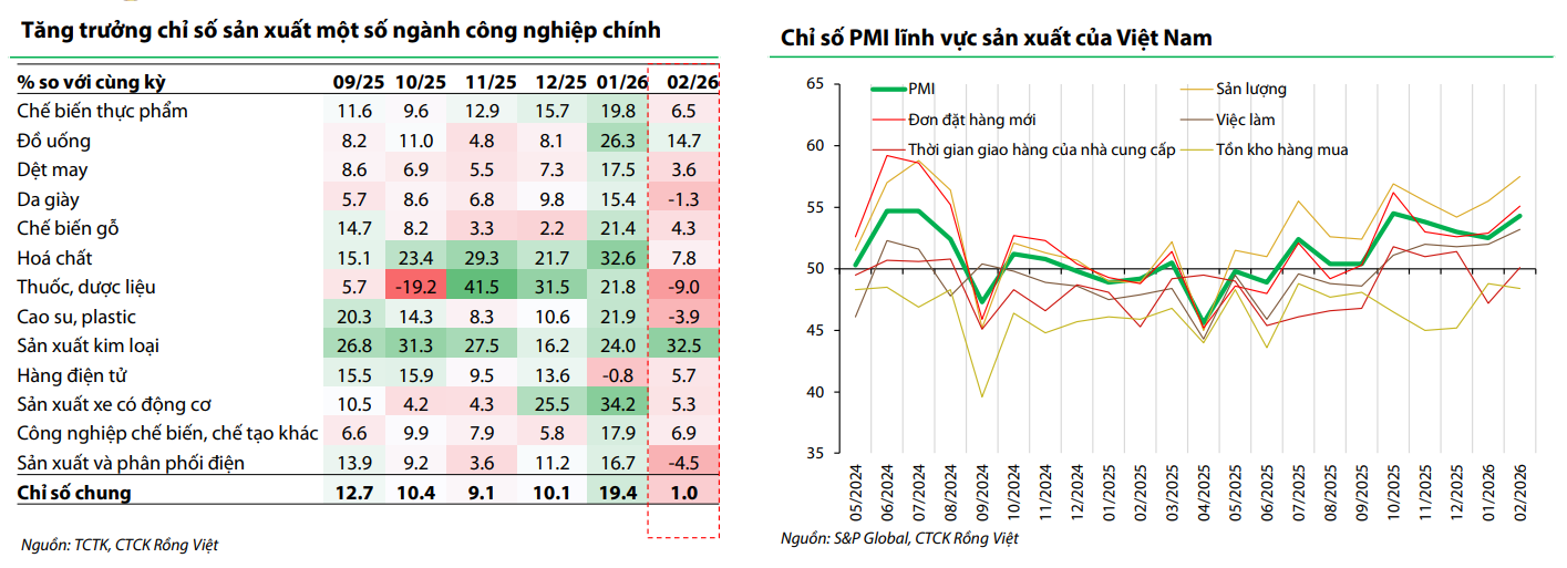 Lũy kế tháng 2 đầu năm 2026, IIP tăng 10,4% so với cùng kỳ, cao hơn mức 7,5% của cùng kỳ năm trước. Trong đó, công nghiệp chế biến – chế tạo tiếp tục là động lực chính.