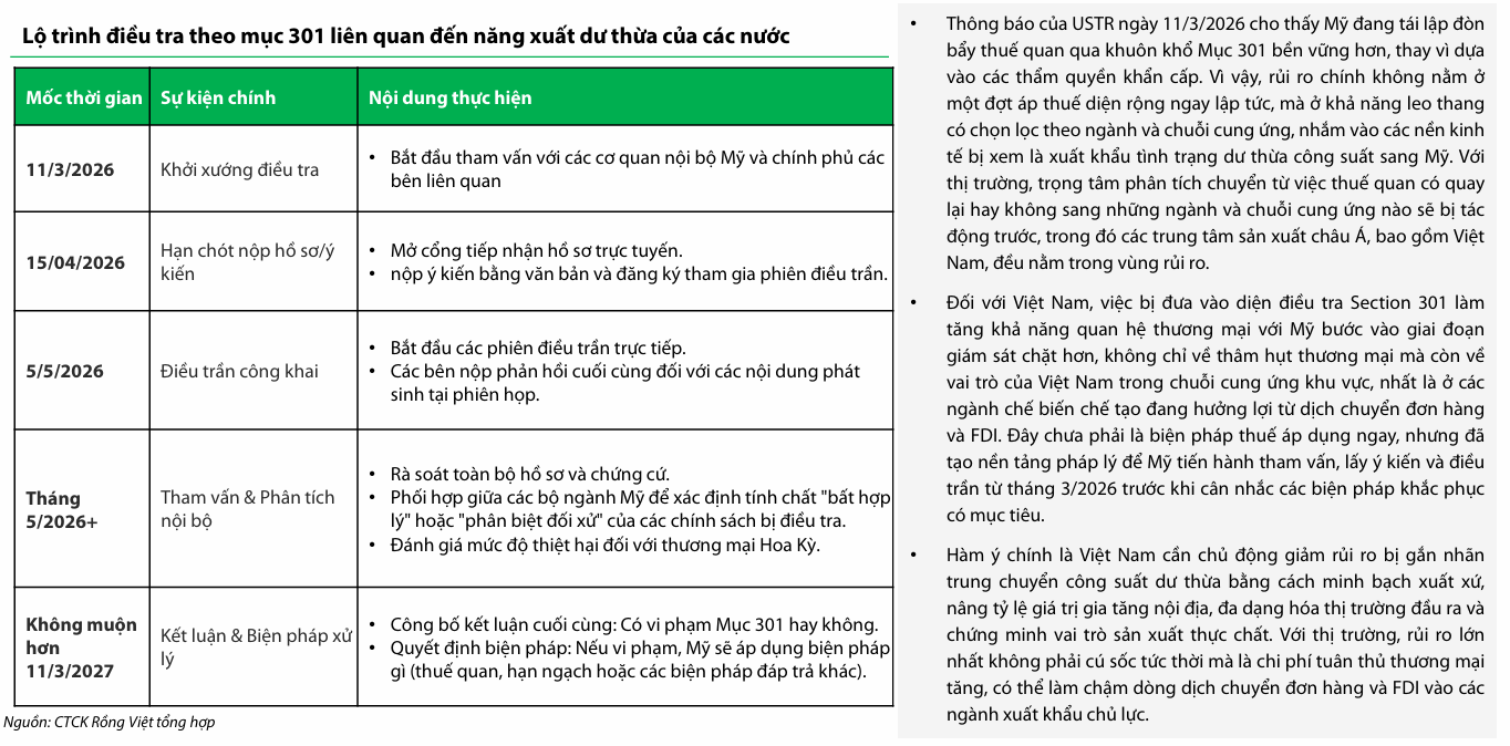 VDSC đánh giá triển vọng "Mỹ chuyển từ cơ chế thuế IEEPA sang Mục 122 giúp giảm áp lực thuế quan ngắn hạn và phần nào cải thiện triển vọng đơn hàng cho Việt Nam”. Tuy nhiên, rủi ro thương mại chưa chấm dứt khi Mỹ đồng thời tái lập nền tảng điều tra theo Mục 301, hàm ý bất định có thể kéo dài trong năm 2026. Do đó, thương mại Việt Nam vẫn có dư địa duy trì tăng trưởng, nhưng triển vọng trung hạn sẽ phụ thuộc nhiều hơn vào khả năng nâng tỷ lệ nội địa hóa, minh bạch xuất xứ và đa dạng hóa thị trường xuất khẩu.