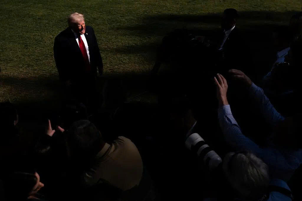 Tổng thống Trump phát biểu trước báo giới trước khi lên chuyên cơ Marine One tại bãi cỏ phía Nam Nhà Trắng để chuẩn bị đến Miami hôm 11/4.. Ảnh: New York Times