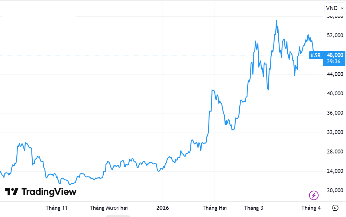 Cổ phiếu MSR hiện giao dịch trên UPCoM, khối lượng gần 1,1 tỷ cổ phiếu. Mã chứng khoán này có bước tăng giá rất ấn tượng từ vùng 25.000 đồng/cổ phần lên 51.000 đồng/cổ phần trong 3 tháng đầu năm. Hiện, cổ phiếu ghi nhận điều chỉnh xuống vùng 48.000 đồng/cổ phần trước thông tin Tập đoàn Masan sẽ bán bớt vốn.